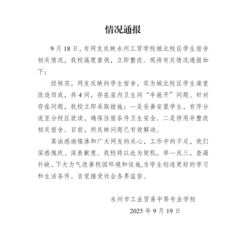 北京在9月19日的新闻中,扬州工业和贸易二级职业学校发布了一份有关这种情况的报告:最近,一个网民发布了一段视频,该视频说他在扬州工业和贸易二级职业学校的宿舍在他所研究的情况下处于良好状态,据称是在公共浴室中变化了。编辑Xin Jing